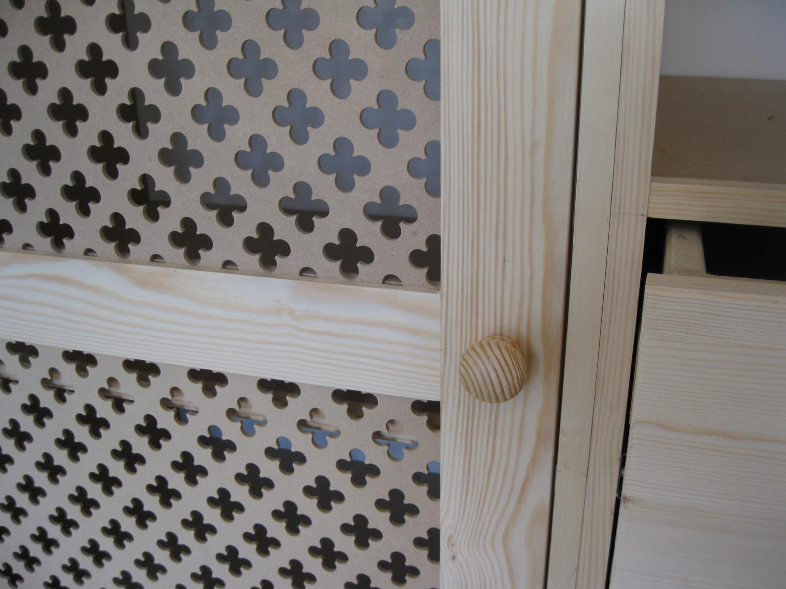 A two door, four drawer wardrobe built into an alcove, the advantage of grilled doors is that the contents of the wardrobe are aired so you avoid that musty smell that sometimes occurs in wardrobes, particularly if that wardrobe is built against an external wall. This format of two doors to the left and right hand with drawers in the middle makes full use of the space provided the drawers are fairly deep 300 mm, giving lots of space to store clothes.Internally there are hanging rails on both sides along with shelves. Constructed from 18 mm MDF with softwood lipping on all exposed edges and joinery grade Redwood for the doors, the grills available in several patterns are 8mm MDF.