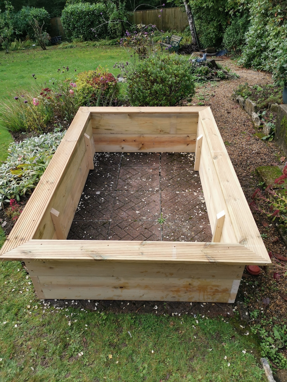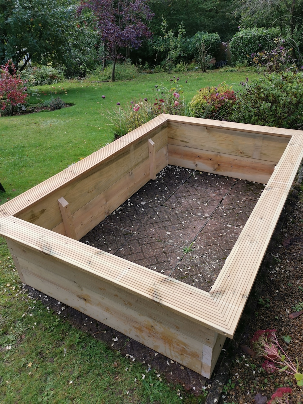A 2.4mt x 1.7mt raised bed that fills an otherwise unused patch in the garden. The customer hopes to grow squash and courgettes around the edges so that they can overhang and leaks and onions in the middle. Should work out well as it is in a sunny position. The decking around the top enables you to sit whilst you work and place tools and pots on.