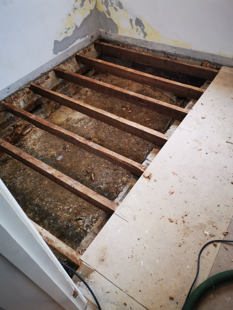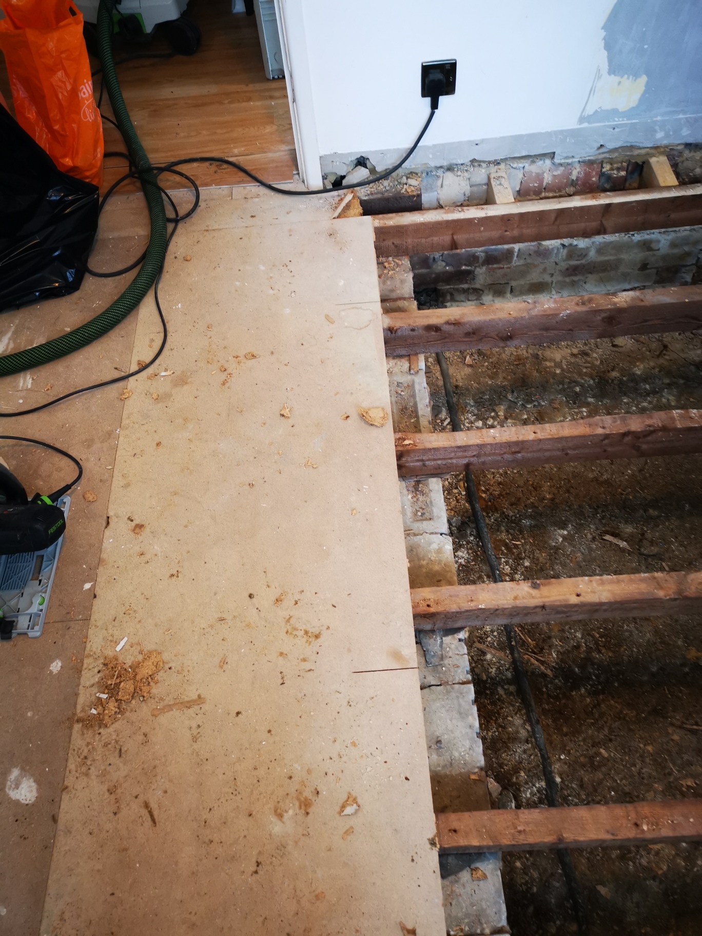 The skirting board originally was a 4″ board so using a 6″ board covered all the scuffing and the footprint of the original board. The flooring itself was 18mm graded chipboard secured by screws with a deep thread and narrow shank which enabled a good grip and resistance to thrust. It’s the resistance to thrust that makes a floor silent for all time. The original floor being nailed meant that the nails eventually lost their grip with the movement of timber and flooring through foot traffic and seasonal influences.