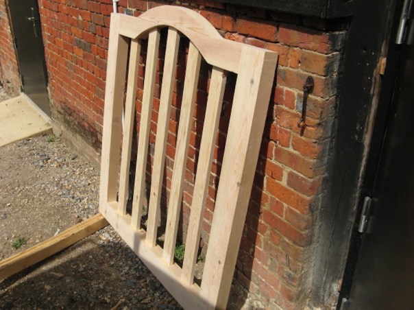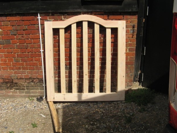 This is a copy of the original which had rotted beyond economic repair. For me this was an interesting project because it involved some curved work which does not come up that often so it gave me a chance to blow off the dust on the bandsaw and use it to achieve the curve. Each mortice and tenon joint was pegged using ¾” Oak dowel as well as glue. This will ensure that the joints remain tight. The old gate had rotted because the joints had opened and rain water had sat in the shoulder between the stile and rails.