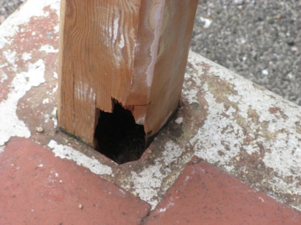 Rot had set in at the base of this post, a common problem. The replacement portion was 800mm long a hardwood key was also inserted to prevent any slip on the joint.
