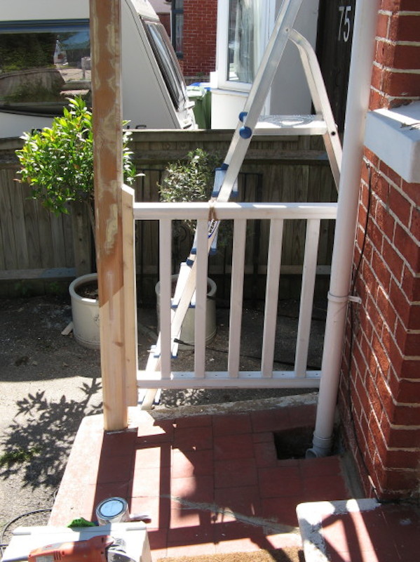 I could have also used a stepped Scarf joint which would have had the same effect as the hardwood key. Because the overall height of the porch was 3.5meters I was concerned that there could still be some movement in the post -possibly buckling , so it was decided to add a handrail and spindles at the end of the porch. This prevents potential buckle in the post and also I think finishes the job off nicely.